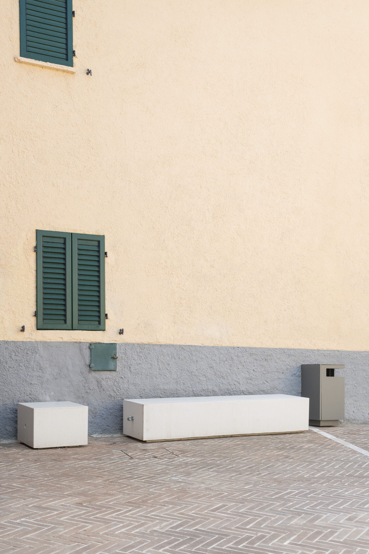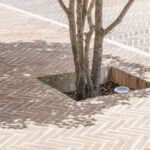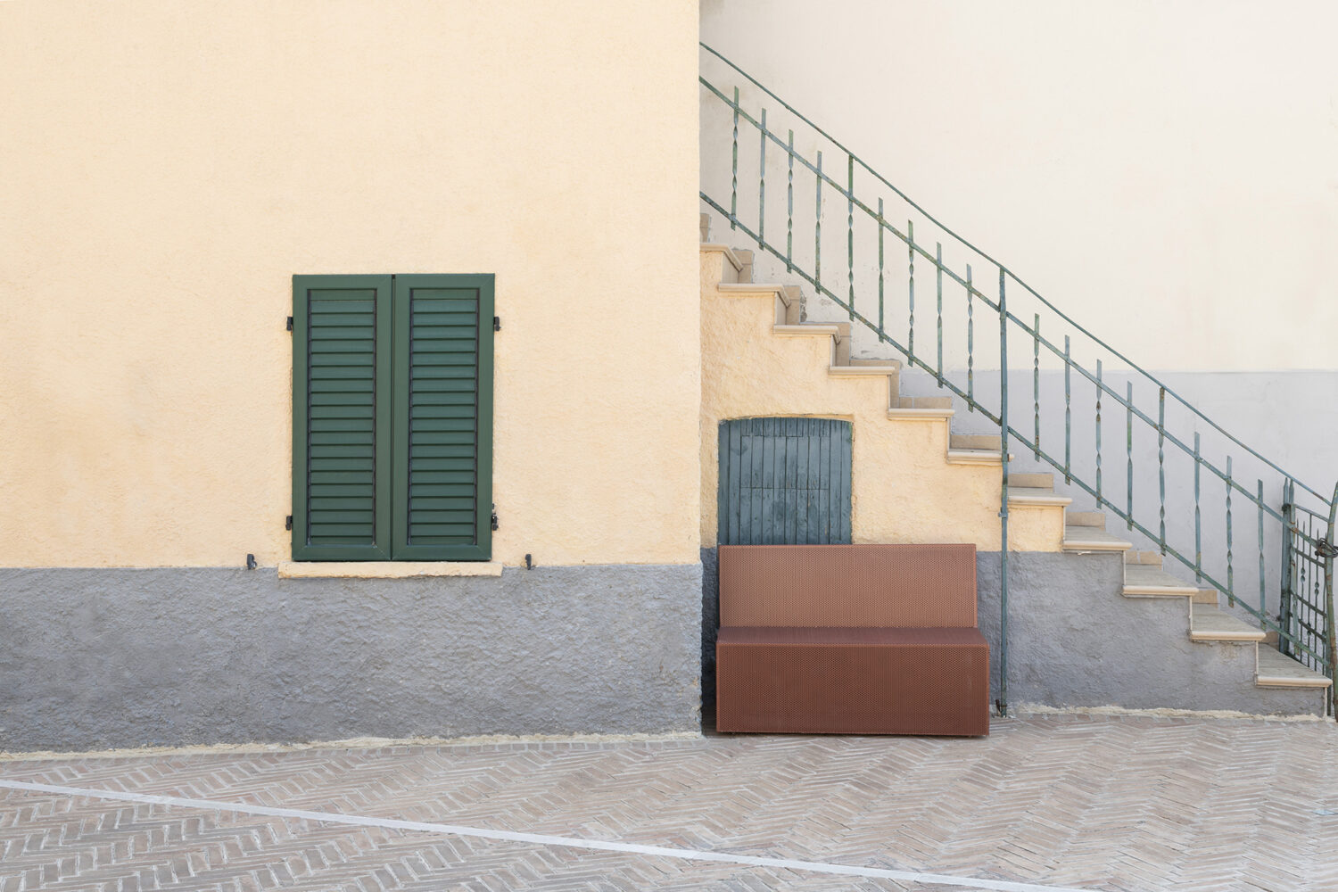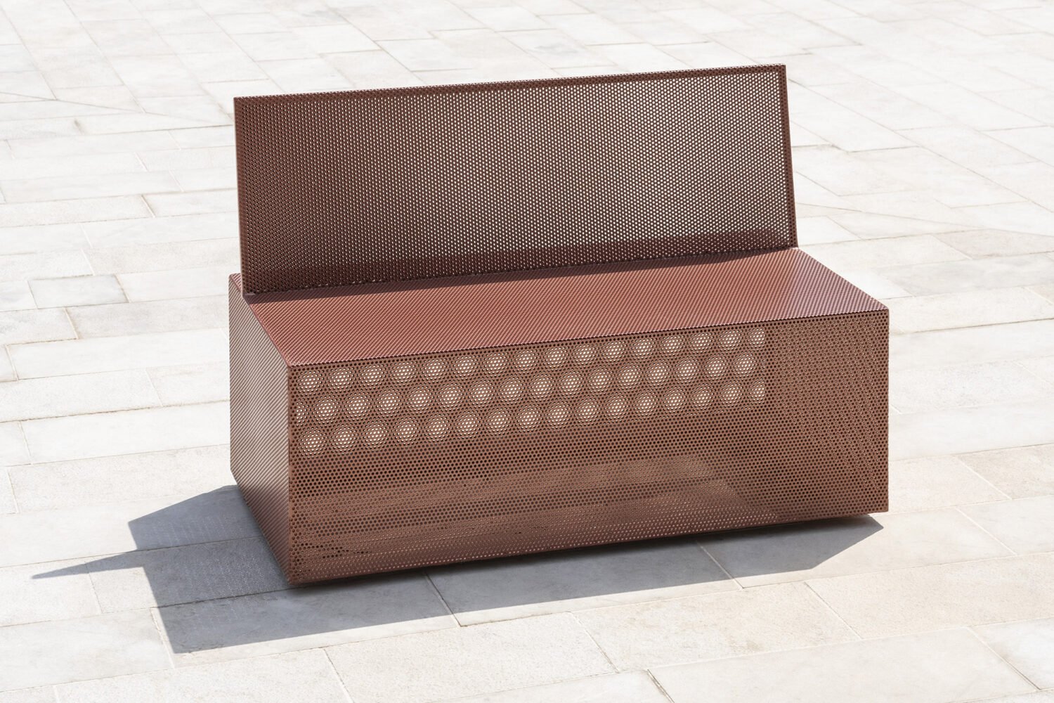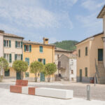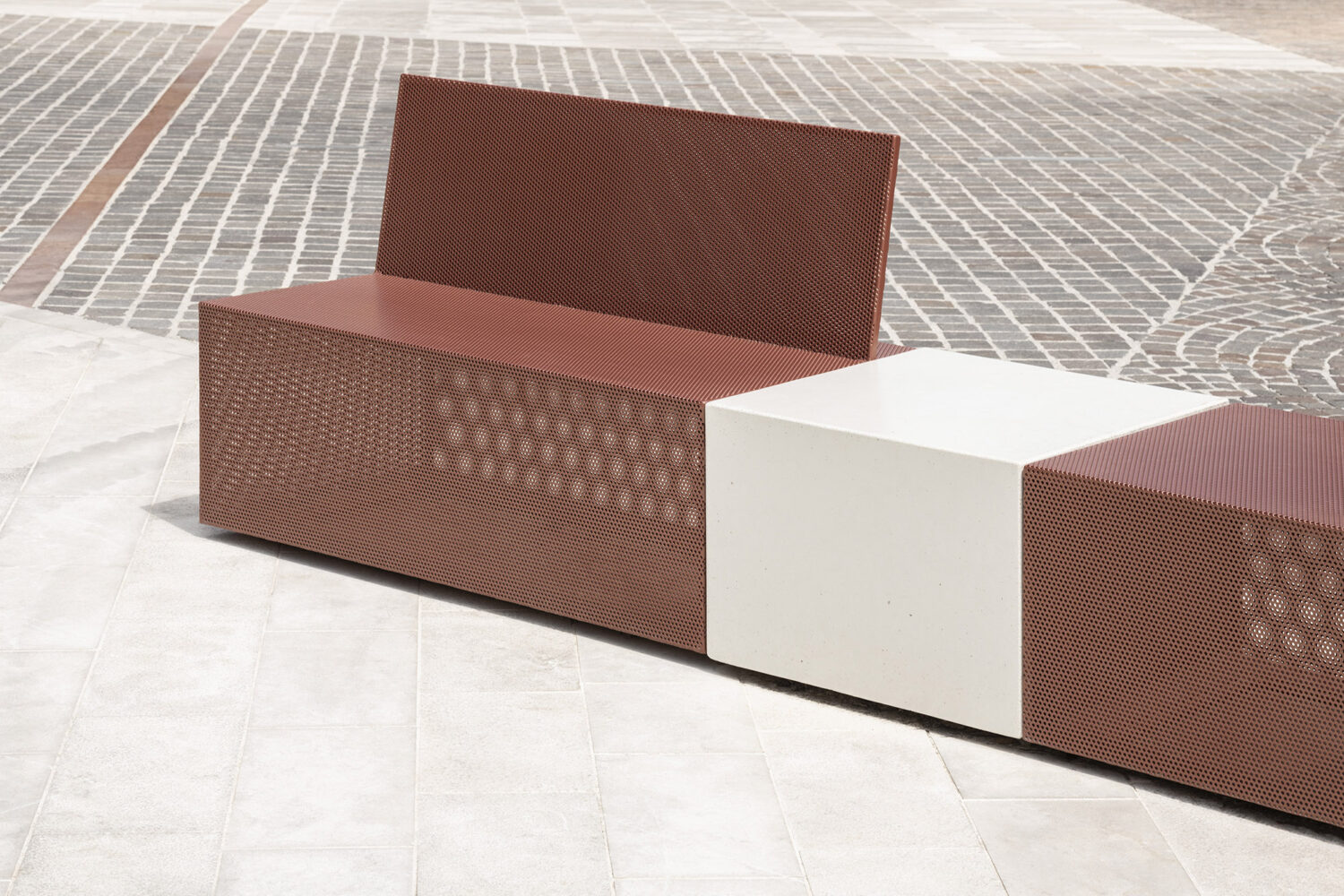 L’arredo urbano, disegnato su misura, è caratterizzato dalla panchina Clara, in lamiera forata, visivamente calda e adatta ai contesti storici, con lo schienale per accogliere il riposo, dove l’acqua scivola via veloce. Durante la sera ricorda una lanterna, chicchi di luce che si proiettano nelle vie e nella piazza per un’atmosfera intima, che concilia la “chiacchiera” e la sosta.