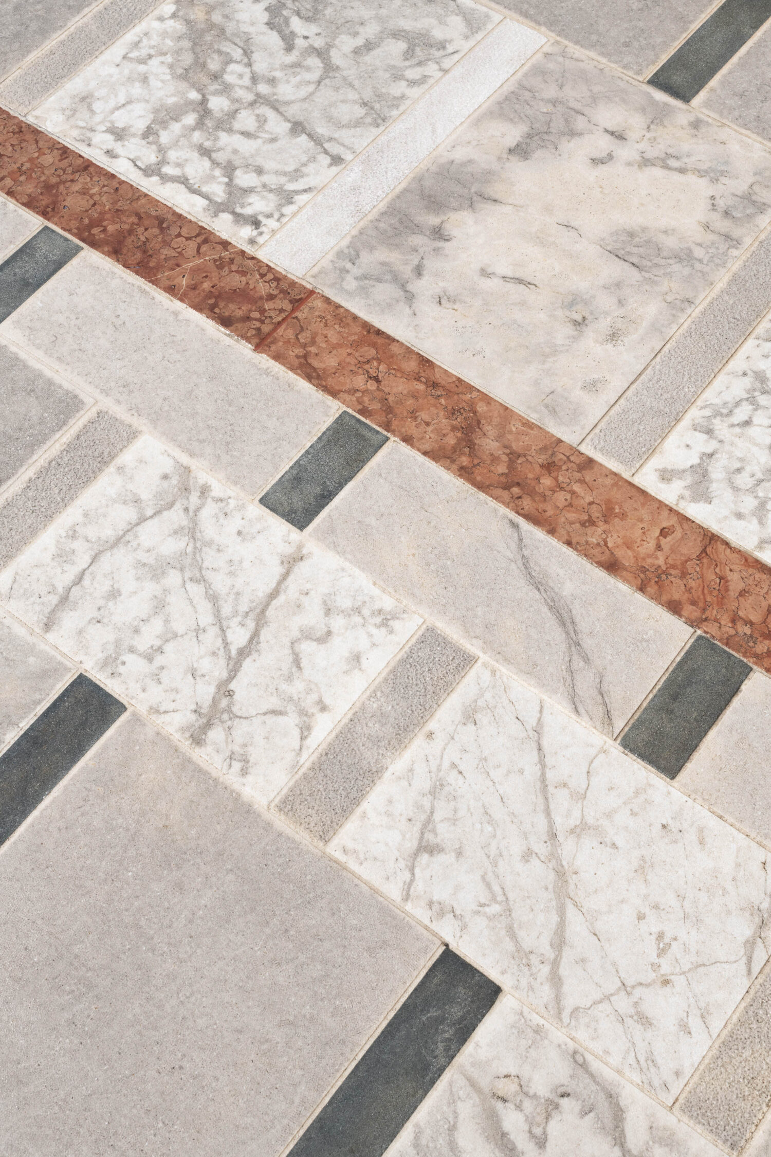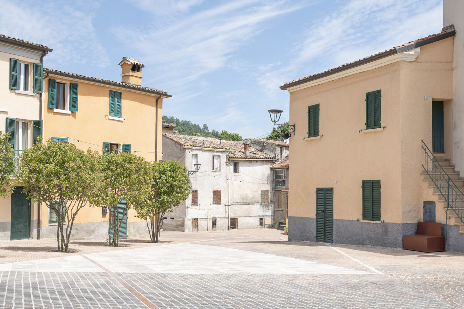L’intervento si articola attraverso un nuovo disegno dello spazio e una partitura capace di guidare direzioni e percorsi. La scelta dei materiali e dei dettagli compositivi ha voluto “riscaldare” l’atmosfera della piazza, privilegiando materiali come la pietra calcarea e il mattone, in un richiamo alle cromie tipiche del Montefeltro. Il mosaico, ad esempio, accompagna il visitatore verso un’area più raccolta: una seconda piazza, più intima e multietnica, oggi abitata da nuove comunità.