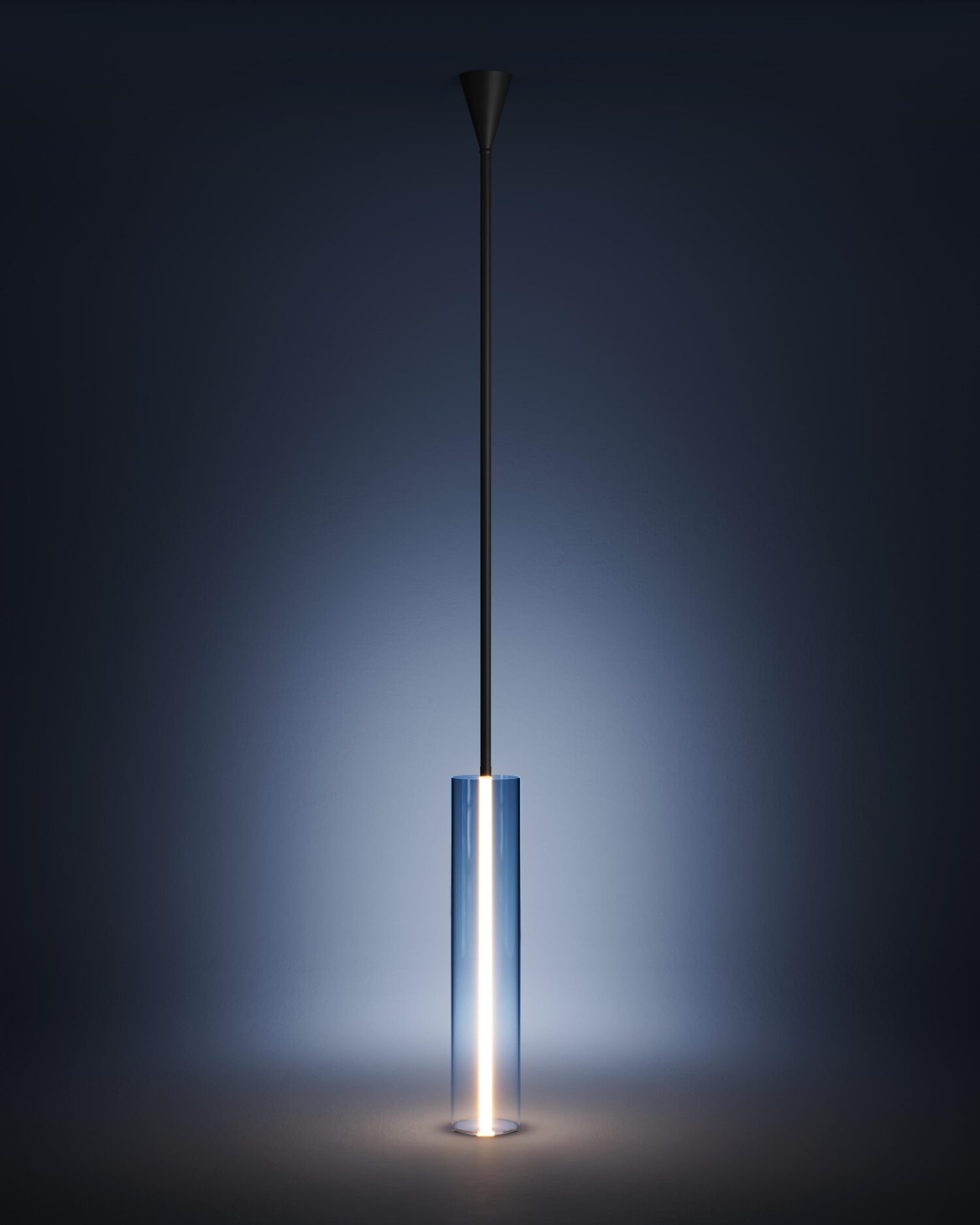 Ora blu, parafrasi di una lampada, dove questa viene semplificata e resa quasi primitiva, una lunga ferula e un vaso. Il sopra e il sotto sono elementi distinti che si uniscono in un rapporto intimo che genera luce. Questa esalta la sfumatura del vaso smaterializzando il tutto, come in un fenomeno atmosferico. La lampada Ora blu ritma l’alba e il tramonto.